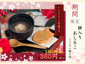 おすすめデザートメニュー 2026年2月5日 立春を迎え春の訪れを感じる季節となりましたが、まだまだ寒さが厳しい日が続いております。 寒い日のラウンドに、ほっこりできるおすすめデザートメニューのお知らせです。 餅入りおしるこ ミニたい焼き付 360円(税込) インスタグラムを見ていただいた方限定50%off 180円(税込)になります。 小豆には疲労回復、むくみ改善、アンチエイジングなどの効果も期待できます。ぜひ、お得なこの機会にご利用ください。 ハーフ休憩で、心も身体も温めていただき後半のプレーも楽しんでくださいませ。 レストラン 舘林